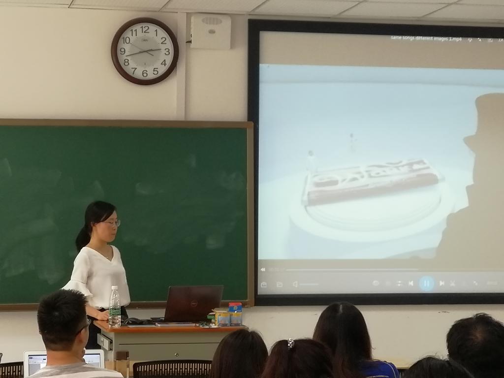 于海玲老师首先给同学们看了两段视频:一段是拥有相同的音乐和不同的画面,另一段是拥有相同的画面和不同的音乐。通过观看视频后的不同感受,于老师告诉同学们:图片和音乐组合起来大于图片或音乐任意一者独立时的作用,音乐和图片的意义是不固定的,他们的重新搭配组合可以产生新的意义,这也是为什么当今电影很少会用原创音乐的原因之一。接着引出了今天的话题:社会符号学眼中的流行音乐——图片、文本与声音。