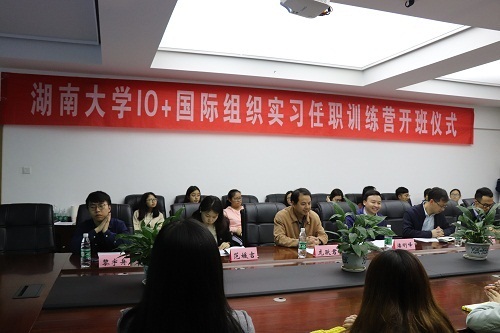 湖南大学招生与就业指导处主任潘刚峰及范媛吉、湖南大学外语院党委总书记龙跃君、党委副书记马春波、2015兼2017级辅导员熊佳俊以及2017年综合素质保研辅导员黎宇舟出席了本次开班仪式。此次io+国际组织实习任职训练营的全体学员均到场参加。
