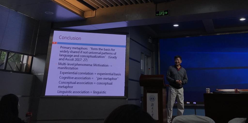 5月16日,来自宾夕法尼亚州立大学的於宁教授在湖南大学外国语学院学术报告厅作了题为Primary metaphor across languages: DIFFICULTY as WEIGHT and SOLIDITY 的学术讲座。讲座由英语系Chris Sinha教授主持。本次讲座的主要内容来源于於宁教授和黄洁教授(华中科技大学)最新被metaphor and symbols杂志收录的一篇文章。