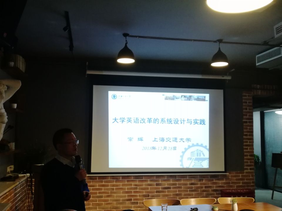 2018年12月28日晚,上海交通大学外国语学院副院长?;越淌谟ρ次以鹤隽颂馕?/span>大学英语改革的系统设计与实践”的学术讲座。讲座由副院长莫再树教授主持。
