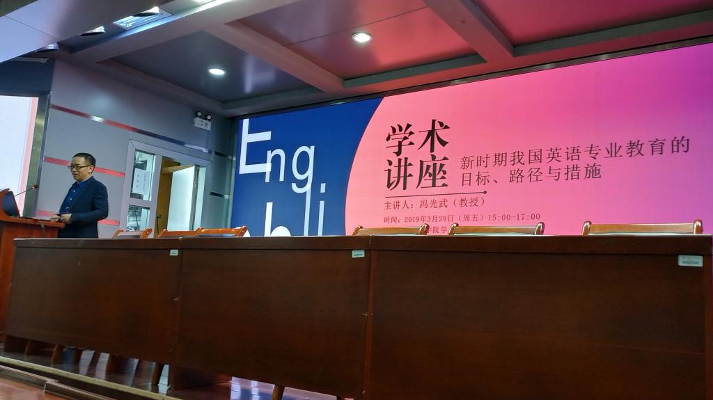 2019年3月29日下午,广州外语外贸大学教授、博士生导师冯光武应邀到我院学术报告厅,做了主题为“新时期我国英语专业教育的目标、路径与措施”的学术讲座。讲座由外国语学院副院长余小强教授主持。