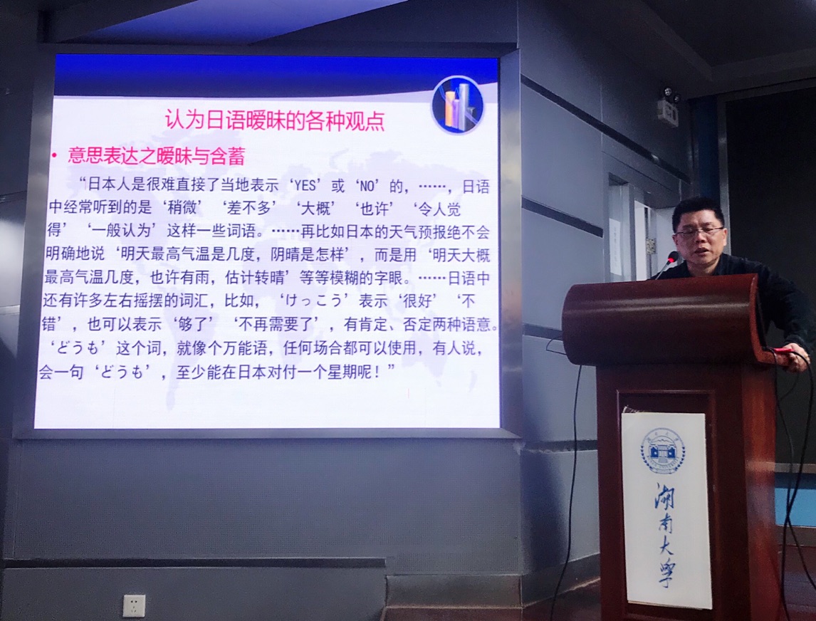 2019年3月21日下午,北京大学博士,黑龙江大学博士后,现任解放军信息工程大学洛阳校区教授、博士生导师,教育部高等学校外国语言文学类专业教学指导委员会日语专业分指导委员会副主任委员,教育部高校日语专业教学测试专家组专家,国家社科基金同行评议专家,《日语学习与研究》编辑委员会委员许宗华教授应邀设席外国语学院学术报告厅,为我院师生作了题为“关于日语是否暧昧的一点思考”的学术报告。讲座由日语系罗明辉副教授主持。