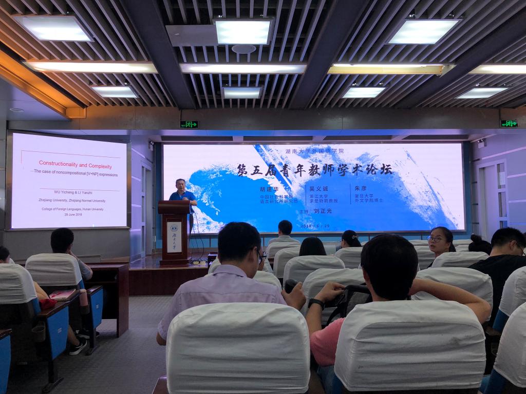 6月29日,外国语学院第五届青年教师学术论坛成功举办,中国社会科学院语言研究所研究员胡建华、浙江大学求是特聘教授吴义诚、复旦大学文学院博士朱彦等受邀参加论坛,并分别做主题报告,外国语学院全体教授、副教授、研究生导师、博士及在读博士参加了论坛,论坛由刘正光院长主持。