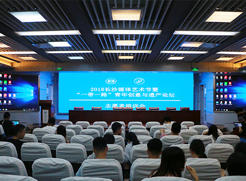 2018年长沙媒体艺术节暨“一带一路”青年创意与遗产论坛志愿者培训会于5月17日和19日在外国语与国际教育学院学术报告厅举行。市委宣传部刘新宙主任、市外侨办社会管理处处长梁舒处长、P8星球总经理李刚、驻留计划统筹陈冶、湖南大学外语院副教授陈千谦、活动组志愿者统筹刘琴琴等嘉宾出席了本次培训会。