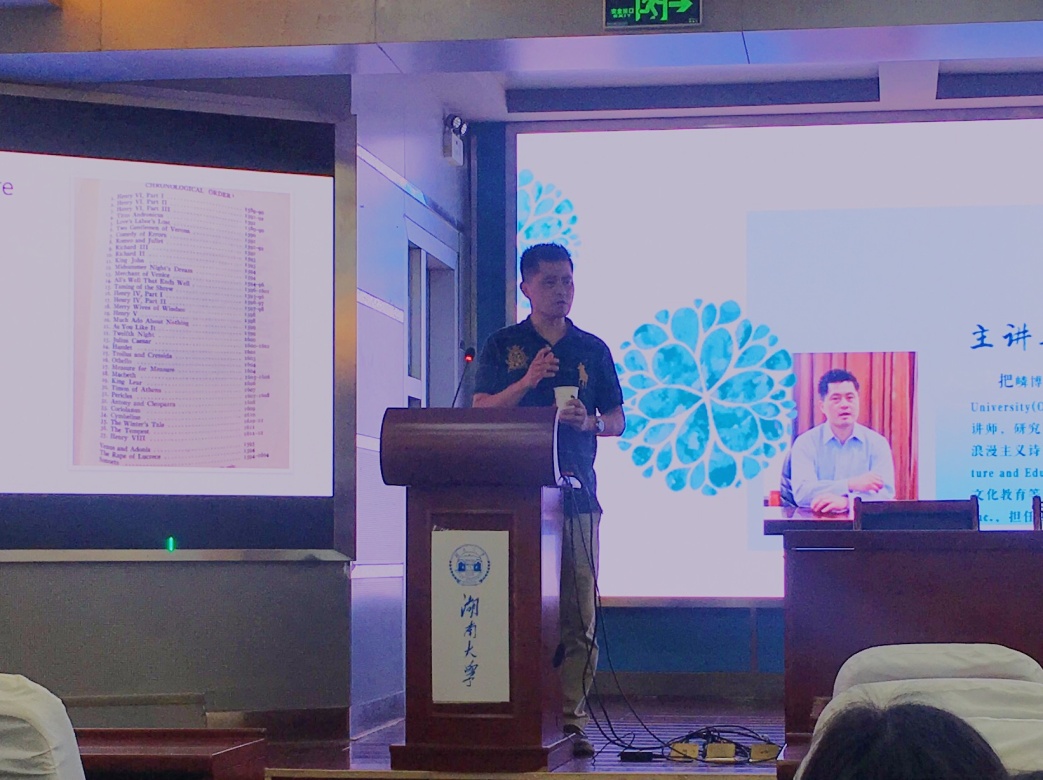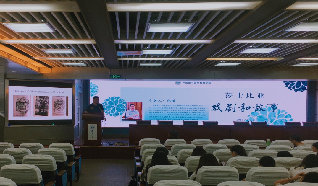 5月5日下午,校国合处和我院特邀专家把嶙博士,在学院学术报告厅为我院师生做了题为“莎士比亚戏剧和故事”的学术讲座。讲座开始,把嶙博士旁征博引,为同学们介绍了英国历史发展概况,并与同学们进行了互动交流。接着,把嶙博士向大家讲述了莎士比亚生平经历,包括时代和历史背景对其戏剧创作的影响。讲座结尾,把嶙博士提出美好希冀,希望同学们珍惜时光,好好对待生活。整个讲座使同学们从多角度对莎士比亚本人及其戏剧创作有了更深刻的认识。学院副院长田臻教授参加并主持了讲座。