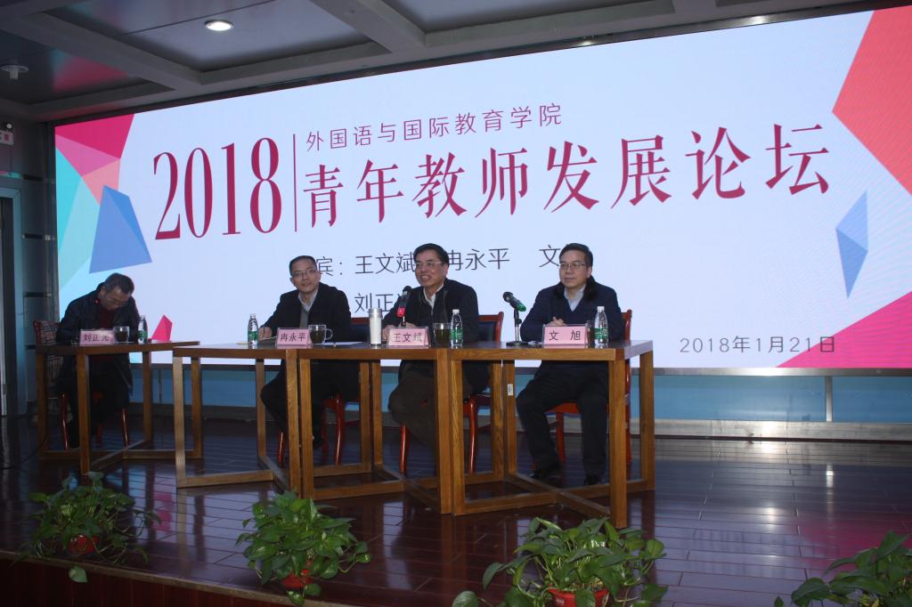 1月21日上午8:30,外国语学院2018年青年教师发展论坛在学术报告厅拉开序幕,国内知名学者北京外国语大学校长助理王文斌教授、广东外语外贸大学冉永平教授、以及西南大学文旭教授受邀参加论坛。论坛分为两个环节,分别为大会发言及分组讨论,主题包括青年教师科研规划和国家级项目申报质量的提升。