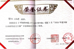 由苏鹰教授指导的、我院日语系2018届本科生曹宇欣与王依婷同学共同完成的论文《日本語における絶対男性語の一考察》荣获由教育部高校日语专业教学指导分委员会、中国日语教学研究会、日本科学协会、吉林大学共同举办的2020年笹川杯日本研究论文大赛语言学组二等奖。此次大赛组委会共收到全国80所高校370篇参赛论文,是历年参赛作品最多的一年。大赛通过评审委员会初审后,每组排名前十的选手入围决赛答辩环节,最终经过激烈的网络在线答辩角逐胜负。此次获奖,彰显了我院日语系教学团队的实力。