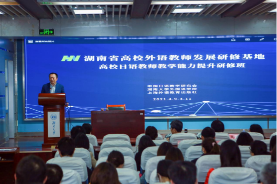 4月10日-11日,湖南省高校外语教师发展研修基地第八期研修班暨高校日语教师教学能力提升研修班在我校成功举办,外国语学院院长刘正光教授在开班仪式上致辞。该研修班由中国日语教学研究会、湖南省高校外语教师发展研修基地、湖南大学外国语学院和上海外语教育出版社共同主办。中国日语教学研究会会长、北京外国语大学周异夫教授,湖南省高校外语教师发展研修基地主任、湖南大学外国语学院院长刘正光教授,湖南大学副院长张佩霞教授,上海外国语大学高洁教授以及四川外国语大学黄芳教授等专家出席本次研修班。参加此次培训的日语教师多达百余人。