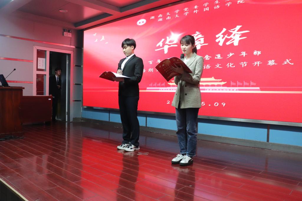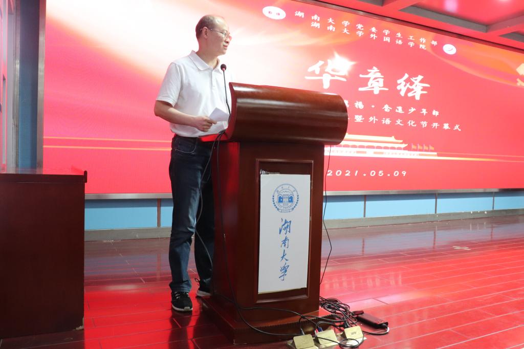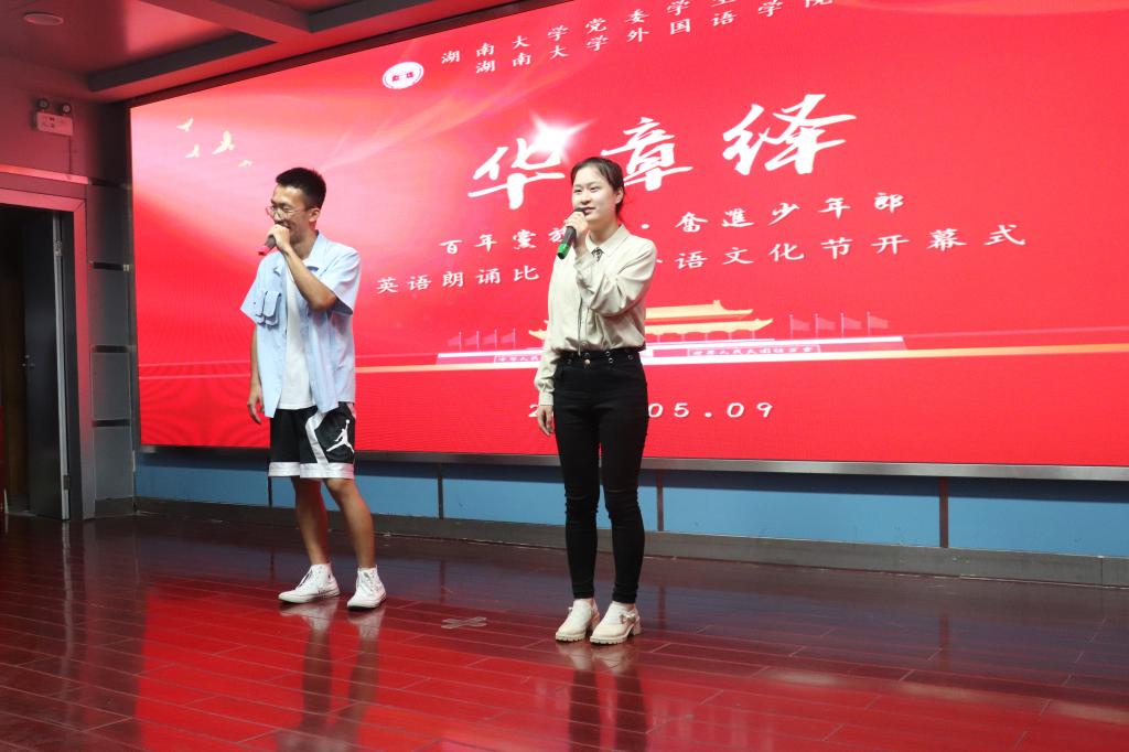 2021年湖南大学华章绎“百年党旗扬·奋进少年郎”英语朗诵比赛暨外语文化节开幕式于5月9日晚在外国语学院学术报告厅顺利举办。