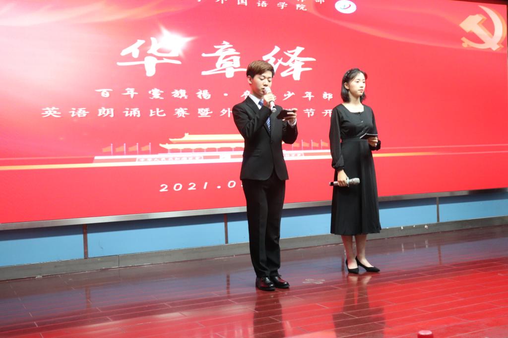 莫再树副院长为此次活动致开幕辞,莫院长指出,2021年是中国共产党建党一百周年。值此普天同庆之际,在党委学生工作部的指导下,外国语学院举办华章绎“百年党旗扬·奋进少年郎”英语朗诵比赛,旨在将专业学科教育与思政教育有机结合,在提高同学们专业水平的同时也向党的百岁生日献上了一份珍贵的礼物。