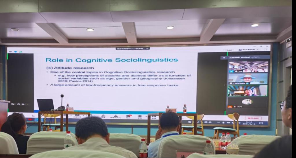 张炜炜副研究员系统介绍了认知社会语言学和分布语义学等概念,从语义变化、词汇变体、句法交替、态度研究等维度探讨了分布语义学在认知社会语言学发展中的作用,并对分布语义学的未来研究作出展望。Chris Sinha教授就相关问题进行了讨论,如分布语义学如何与传统认知语义学方法相结合、认知文体学如何与认知诗学相结合等。