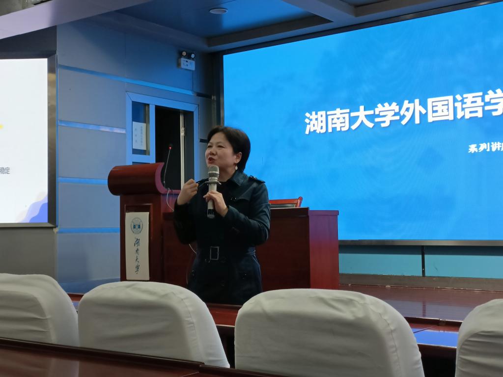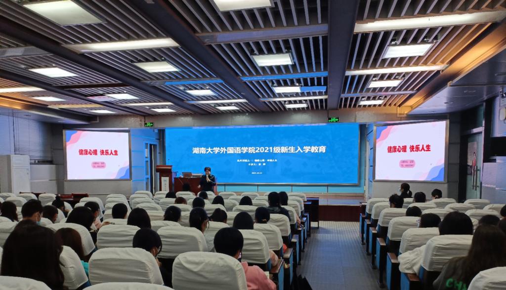 湖南大学外国语学院2021级新生入学教育系列讲座之心理健康教育于10月22日晚7点在外国语学院学术报告厅成功举办。心理健康已日渐成为校园及社会生活中人们热切关注的重要话题,湖南大学外国语学院积极响应学生心理指导需求,及时了解和掌握同学们进入大学后的学习情况和身心健康状态,并根据新生们的心理现状开展本次讲座。本次讲座以“健康心理,幸福人生”为主题,由湖南大学心理健康教育中心彭萍老师主讲,外国语学院本科2018级兼2021级辅导员肖佳美老师主持,2021级全体本科新生参与本次讲座。