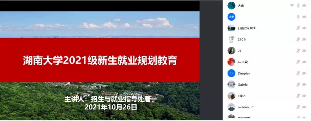 2021年10月26日下午四点,外国语学院2021级新生第二场入学教育讲座通过腾讯会议线上平台顺利举办。为提升新生的就业意识,确定有效的职业发展目标和生涯规划,湖南大学外国语学院特开展新生就业规划教育讲座。本次讲座由湖南大学招生与就业指导处唐一老师主讲,由研究生助理辅导员王敬业老师主持,外国语学院2021级全体本科生及研究生参会。