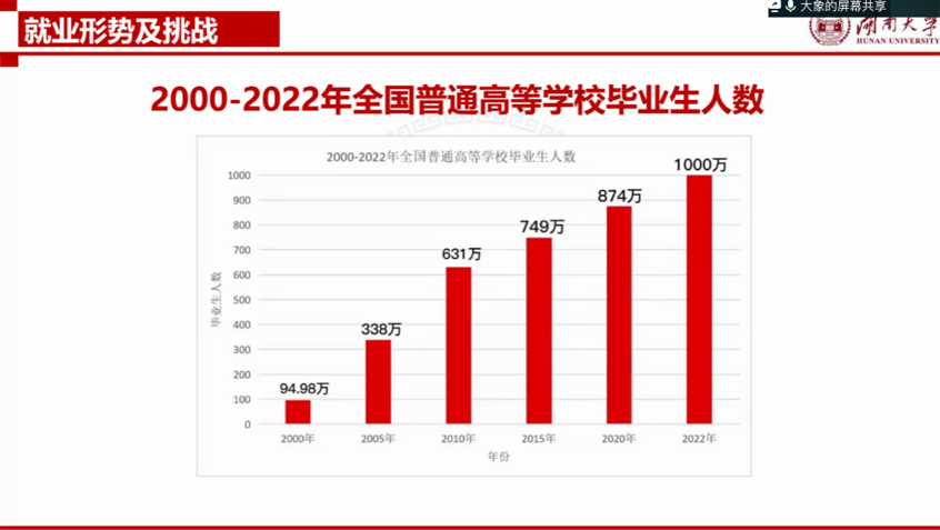 此次讲座唐老师围绕“湖南大学2021级新生就业规划教育”这一主题,从当前毕业生面临的就业形势及挑战、人职匹配模型的作用及运用、如何做好就业规划及准备三个方面进行了讲解。近几年全国普通高等学校毕业生人数大幅增加,就业竞争愈发激烈。但同时也要认清双一流高校学子的优势,当下认真努力,做到就业时胸有成竹。无论是就业还是继续深造,都应该尽早确定目标,提前做好规划。