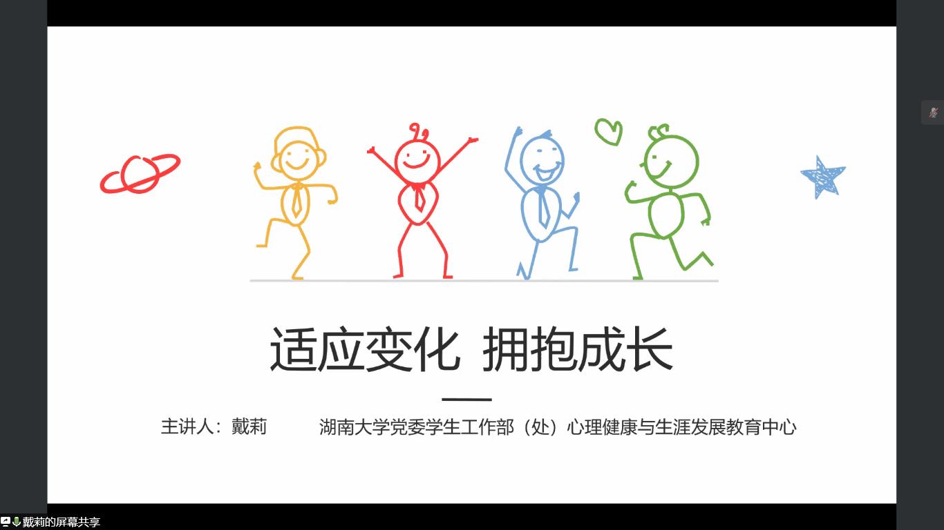 2021年11月2日下午三点,外国语学院2021级研究生第三场入学教育讲座通过腾讯会议顺利举办。为培育和引导我院研究生新生积极向上的健康心理,特举办以“适应变化,拥抱成长”为主题的心理健康教育讲座,由湖南大学心理中心专职心理咨询师戴莉老师主讲,由研究生助理辅导员王敬业老师主持,外国语学院2021级全体研究生参会。