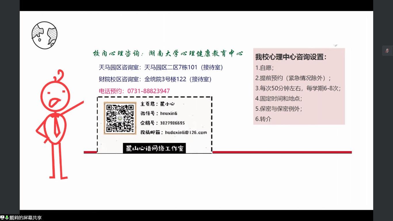 此次讲座,戴老师主要从适应研究生生活以及湖南大学心理健康服务两方面进行了讲解。
