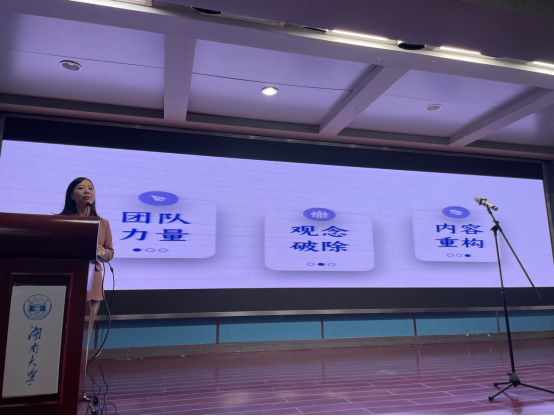 我院优秀教师张驰副教授,在刚刚结束的2021年湖南省普通高等学??纬趟颊萄П热?,获得大学英语组一等奖第一名的好成绩。她从自身的参赛经验出发,与全体教师热情分享了课程思政教学的体悟及心得。