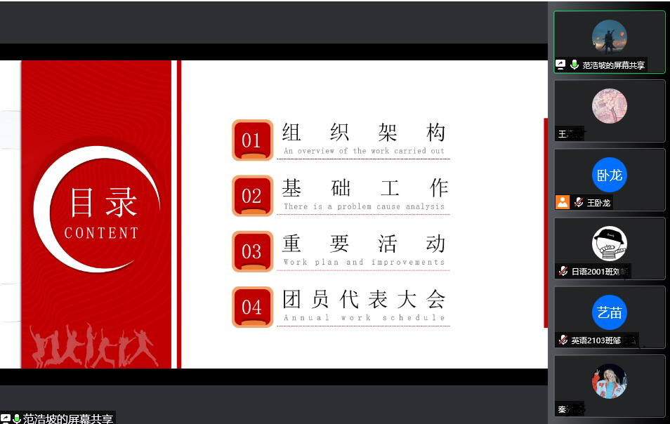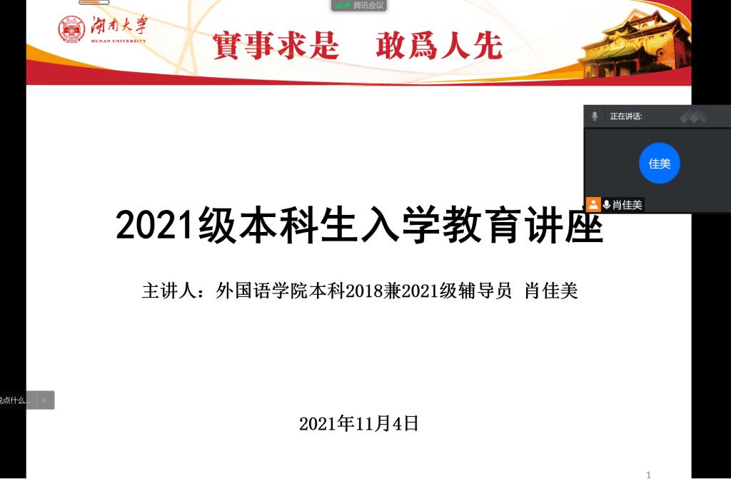 2021年11月4日晚上七点,外国语学院2021级新生入学教育之“学生事务介绍”主题讲座通过腾讯会议顺利举办。为增进我院新生对学生事务的了解,特邀请湖南大学外国语学院学生工作办王卧龙老师、范浩坡老师、肖佳美老师分别就党建、团建和学生事务三方面进行讲解。本次会议由外国语学院本科2018级兼2021级辅导员肖佳美老师主持,外国语学院2021级全体本科及研究生新生参会。
