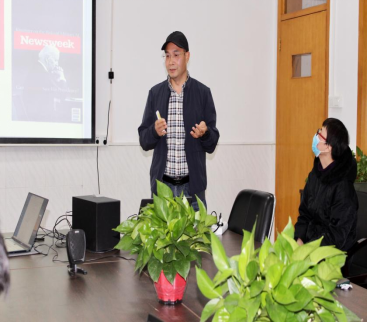 陈勇老师就《英语报刊阅读》课程思政的教学设计娓娓道来。陈老师首先呈现了该课程的特点,然后具体介绍了如何把思政元素融入每一堂课中。他要求学生进行课前报告,自己深耕教材,用心挖掘每一讲中的思政元素,并请同学们以组为单位自制英语报刊,以培养学生们的动手能力与创新能力。