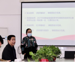许俊老师分享了《口译基础》的课程思政经验。许老师通过展示学生优秀的口译作品,如“岳麓书院的介绍”、“湖南省博物馆导览”、“湖湘美食体验”等。学生们从准备中文讲解词、实地口译讲解词、视频录制、字幕制作等一系列实践操作中不仅学会了如何讲好中国故事和传播中国文化,更提高了团队协作能力,培养了精益求精等“工匠精神”。