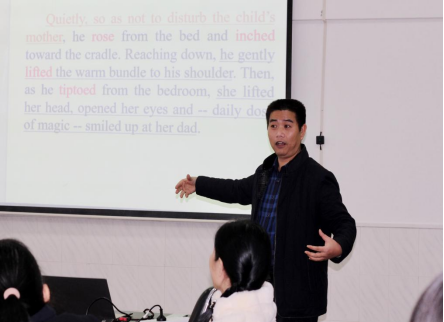 接着,四位课程思政经验丰富的老师就各自负责的课程,与大家分享了精彩生动的课程教学设计和内容。张云老师以“First Snow”为例,分享了他在《笔译基础》课程中如何把“父亲的爱、家的温暖和家的情怀”等思政元素融入课堂教学中。他强调该课程旨在培养高素质、强能力、英汉差异意识强、文学修养高的英语专业人才。张老师非常注重鼓励学生把现实生活的体验和对语言的观察与笔译实践结合起来,巧妙地引导学生在对文学语言进行深度鉴赏,发现问题,并分析问题,最后用优美地道的汉语精准地“改写”英语原文。