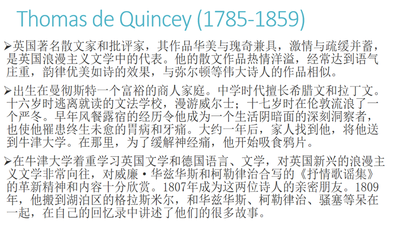 随后,高焓老师向同学们介绍《一个英国瘾君子的自白》一书的作者———Thomas de Quincy,简要介绍其文学地位、写作风格、生平经历以及本书写作背景。他是英国著名散文家和批评家,其作品华美与瑰奇兼具,激情与疏缓并蓄,是英国浪漫主义文学中的代表。