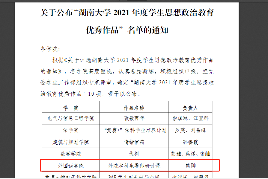 12月15日,我校2021年度学生思想政治教育优秀作品评选结果揭晓。外国语学院副书记熊翀老师负责的“外院本科生导师研讨课”获评“湖南大学2021年度学生思想政治教育优秀作品”。全校仅10项。