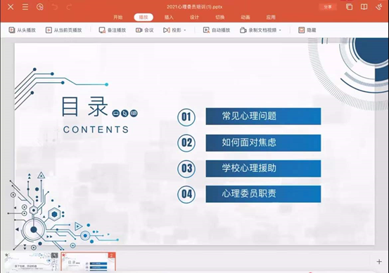 本次培训从常见心理问题、如何面对焦虑、学校心理援助和心理委员职责四个方面展开。