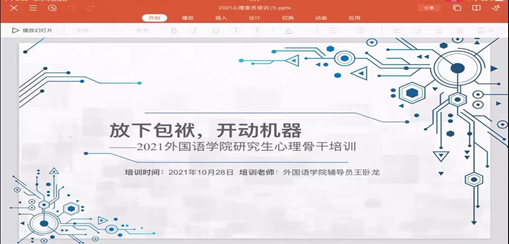 为提高和加强我院心理健康教育工作建设,充分发挥班级心理委员在心理健康教育工作上的作用,我院于10月28日中午于腾讯会议2021级心理委员培训讲座,由辅导员王卧龙主讲。