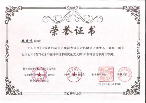 2022年1月16日,“2021年笹川杯日本研究论文大赛”决赛顺利举行。我院日语专业共有8组本科生完成的8篇论文荣获三等奖2项、优秀奖6项。其中,邓超群副教授指导的魏晓悦获语言学组三等奖,论文题目为《日语发音与潮汕方言对应关系考察——以拗音为中心》;宋丹副教授指导的邢雪蕾/易玫彤/张若兰(组)获文学组三等奖,论文题目为《<山月记>在中国的经典化研究》;苏鹰教授指导的王心语、肖宇涵/陆星羽(组)获语言学组优秀奖;戴松林副教授指导的陈一宁、牛万莉、马欣舒获文学组优秀奖;宋丹副教授指导的陆相凝获文学组优秀奖。