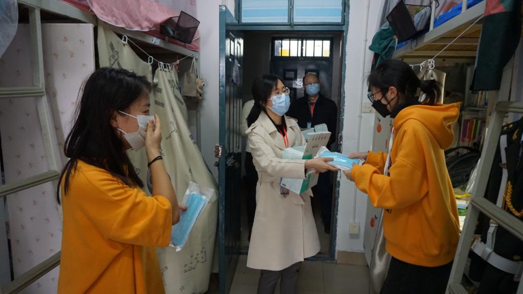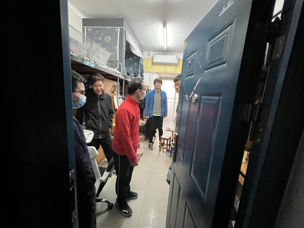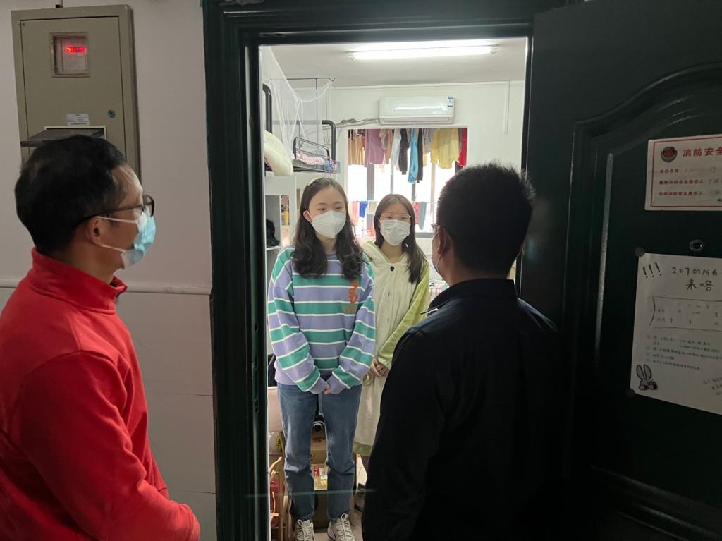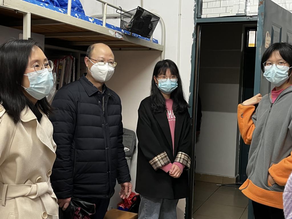 接到召集令后院长莫再树教授第一时间报名,27号晚上连夜部署好学院师生防控工作后,第二天一大早就参与到了学生园区的核酸检测工作中,整个上午没喝水没上厕所,直到下午两点多才返回校区,路过家门口顾不上进家门就急忙赶到办公室,线上组织召开学院第二次防控工作小组会议,检查学院师生防控工作的落实情况。当了解到园区需要入驻人员,莫院长又一次主动请缨,29号清早带上简单行李入驻徳智园区,并立即投入工作。莫院长在学院第三次防控工作小组线上会议对园区第一天的工作总结如下:“德智园区的各项防控工作有序开展,学校也妥善安排了我们的食宿,上午协助组织学生做核酸检测,下午线上上课,晚上走访宿舍与学生聊聊天,一切都好,非常充实!”接下来的几天,核酸检测现场、学生宿舍走访、分发口罩、运送盒饭及搬运物资途中都有莫院长忙碌的身影。一次在电话布置学院工作时莫院长开心地说:“今天在工作现场碰到一个学生志愿者叫我,说‘刚在线上上完您的课,很高兴在这里又见到您了!’,看到自己学院的学生能够积极参与到抗疫工作很欣慰?!本」芄ぷ餍量?,住宿条件简陋,但莫院长特别庆幸自己在学生最艰难的时候能够跟他们站在一起,与他们并肩“作战”,能够这么近距离地与学生随时聊上几句,一说起这些可爱的学生,他感觉一切辛苦都值得。4月1号晚上,莫院长专门带领同样入驻德智园区的外国语学院副院长于海玲,以及范浩坡和肖佳美两位辅导员深入本学院学生的11间寝室,看望了40多位外国语学院的本科生同学,跟同学们亲切交流。莫院长说到:疫情无情人有情,园区的志愿者都很辛苦,但没有人抱怨,都在尽最大努力守护我们的学生、守护我们的家园,相信在大家的团结一致下,我们一定能够尽快打赢这场疫情阻击战。