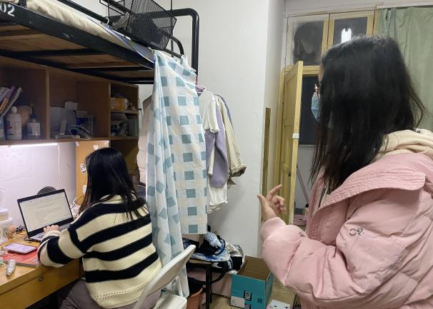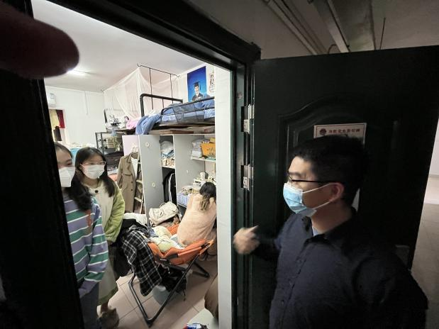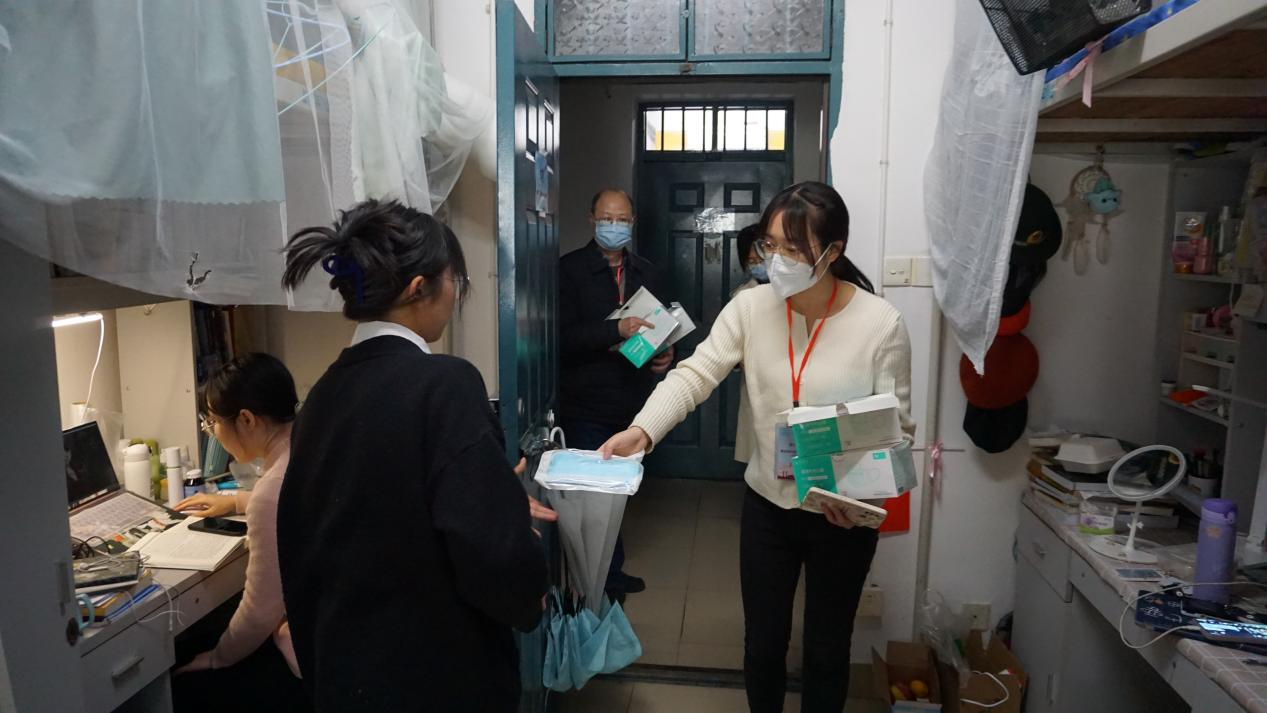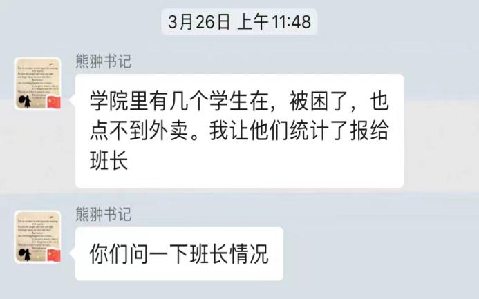 辅导员范浩坡、肖佳美老师也在第一时间赶到学生宿舍入住园区,作为楼栋包干老师,负责学院工作的同时还担起服务管理一个楼栋所有学生的责任,紧急摸排时空伴随者,转运红黄码学生,安抚学生紧张情绪,处理突发事件。凌晨一点,范浩坡老师还在协调学生第二天的餐食;凌晨三点,肖佳美老师还在帮忙运送红码的同学。助理辅导员吴庆林、熊瑶宇也在第一时间把学校通知转达给每一位同学。抗疫一周,吴庆林精准摸排研究生的位置、健康状况,及时报送统计数据;熊瑶宇为大家派送防疫物资,组织志愿者为大家派发三餐,及时收集反馈同学们的困难,尽快帮助同学们协调解决。