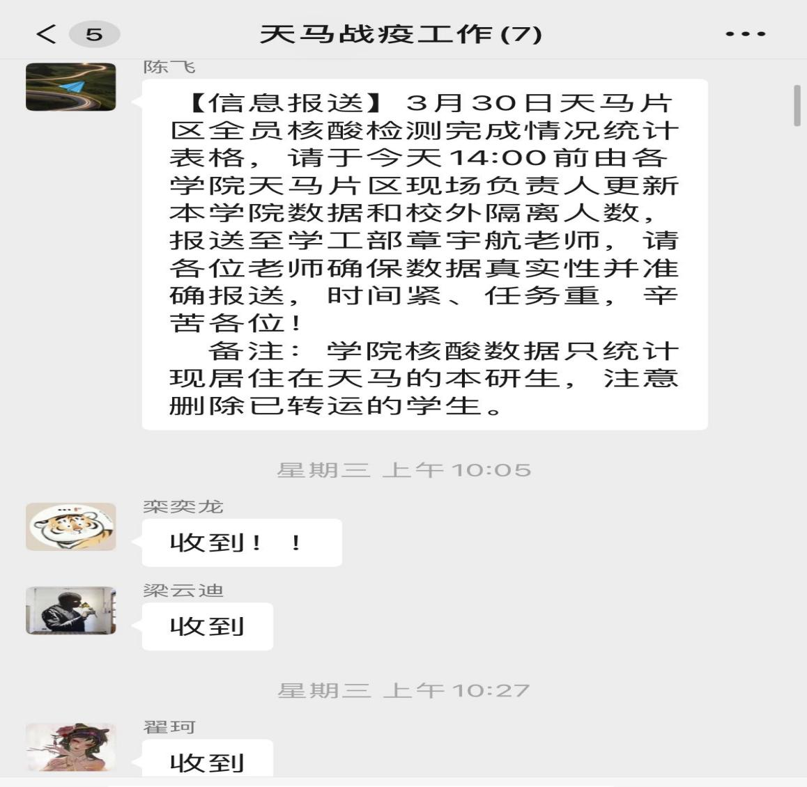 党委副书记熊翀在居家隔离的状态下云端工作,指导院学工团队有条不紊的开展抗疫防疫,数据统计报送、核酸检测组织、学生的关心关怀、心理咨询等工作往往持续到深夜凌晨,为同学们搭建了一道坚固的抗疫防线。她特别关注同学们的所需所想,紧急调度,为滞留学院的同学安排午饭,为面试困难的同学协调合适的环境...