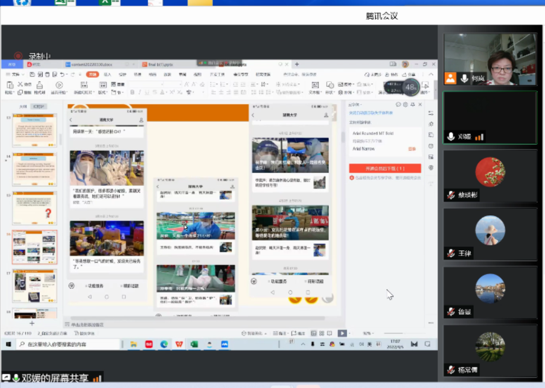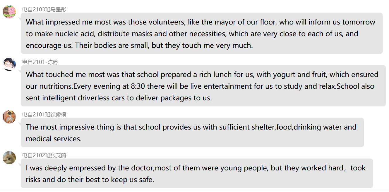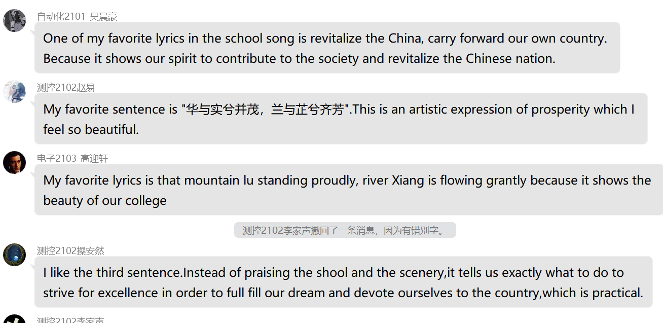 在外语课堂教学中,老师们将课程思政自然地融入,教学效果受到学校督导的一致好评。如邓媛老师引导同学从湖南大学校歌歌词英译感受湖大精神,周思静老师布置用英语进行学??挂叩母腥耸录7窒?,蔡琰彬老师鼓励同学通过国内外抗疫对比来探讨我国以人为本、生命至上的精神等。老师们在教学的每一个语言活动中努力融入对抗疫精神的学习和对科学精神的追求,帮助学生树立必胜的信心,用实际行动践行了课程思政的教学理念。同学们在QQ群信息和presentation中表达了对疫情工作人员及学校的感恩,对家国的责任,课余主动参与志愿者活动,在学习中更展现了努力、奋进、积极的学习态度。