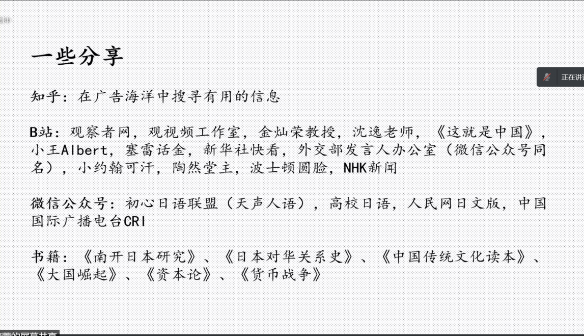 随后,曹婧萱同学向同学们分享了一些查找相关资料的平台,以便同学们为参与外交部定向人才选拔做准备,主要为知乎、B站、相关微信公众号以及一些专业书籍,并详细介绍了相关内容和作者。