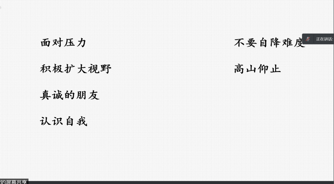 紧接着,曹婧萱同学介绍了参与外交部定向人才选拔的宝贵收获。她将个人收获概括为六个词组,包括“面对压力”“积极扩展视野”“真诚的朋友”“认识自我”“不要自降难度”和“高山仰止”,并就自我体会和深刻领悟进行了生动讲解,与同学们分享了参与外交部定向人才选拔的成长历程。