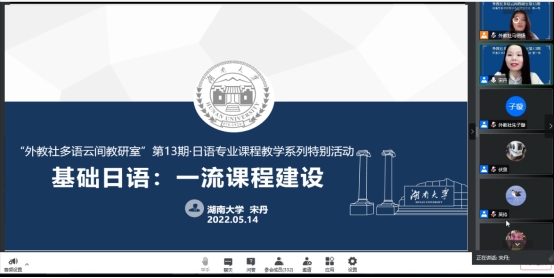5月14日,我院副教授宋丹应上海外语教育出版社之邀,做了题为“基础日语:一流课程建设”的线上讲座,分享了湖南大学日语专业一流课程建设经验。讲座通过钉钉平台、腾讯会议在线直播,吸引了全国近千位同行观看。