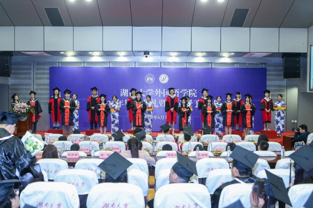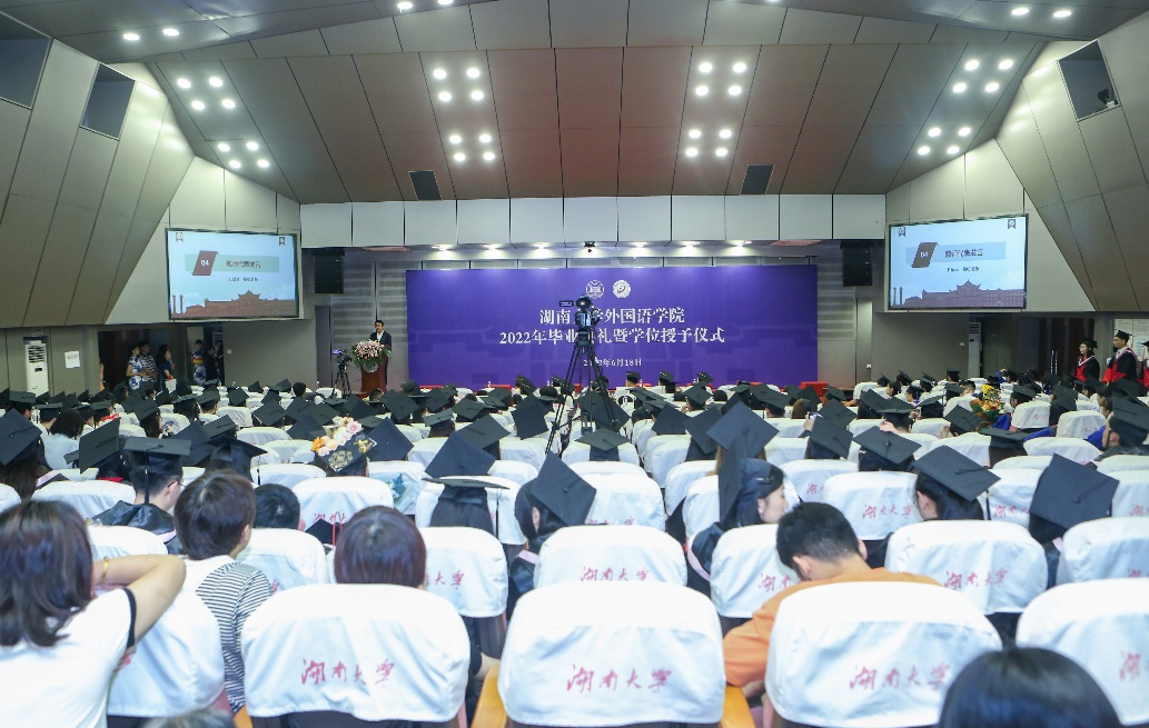 麓山夏日的微风如约而至,吹响了毕业的号角。2022年6月18日下午,湖南大学外国语学院2022年毕业典礼暨学位授予仪式于湖南大学逸夫楼报告厅举行。外国语学院党委书记陈希、院长莫再树、党委副书记熊翀、副院长余小强、于海玲、宋丹、任远、院长助理陈飞及学院研究生导师代表、班主任代表、教师代表,学院行政办、培养办以及学生办的老师代表等出席本次毕业典礼。典礼由毕业生郑玮祎、李恺恒主持。