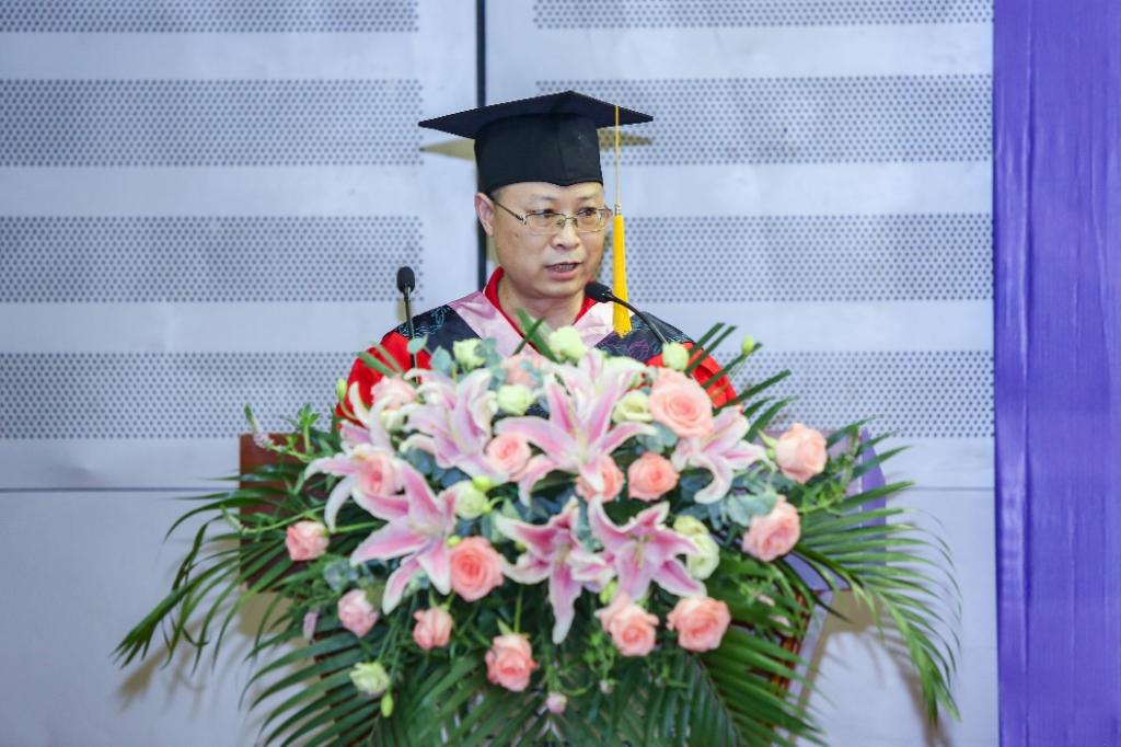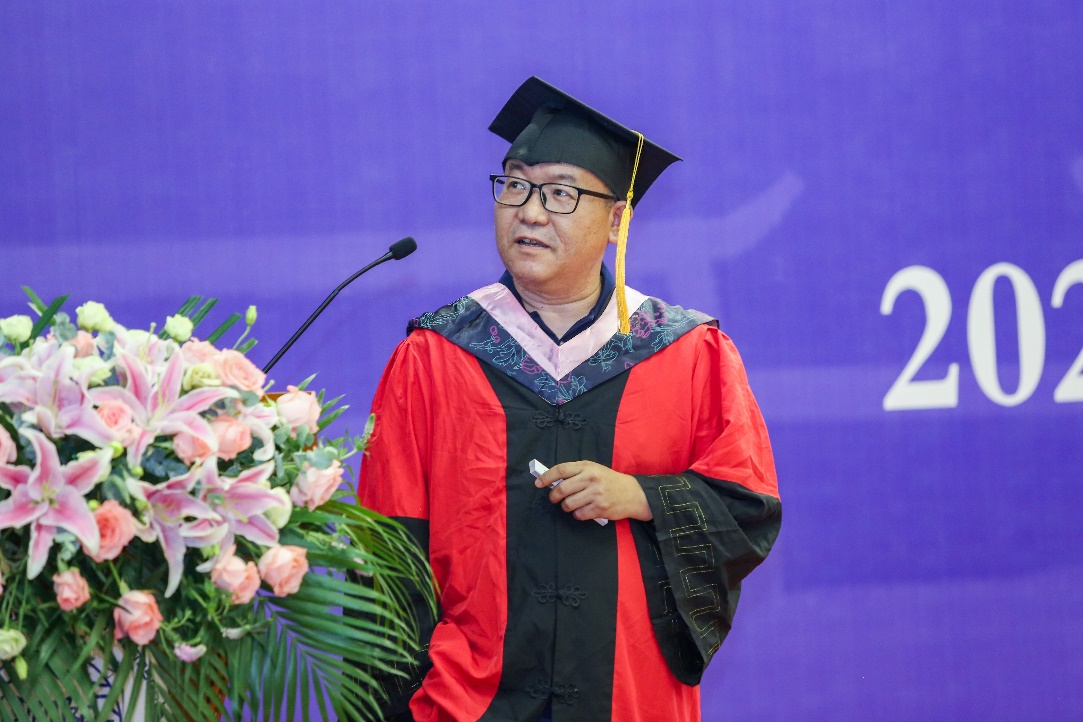 典礼在雄壮的国歌声中拉开帷幕。莫再树院长以“读书不觉爱己深,一寸光阴一份情”主题的深情致辞回顾了与学院2022届毕业生的难忘点滴。莫再树院长对大家顺利完成湖大之旅表示祝贺,同时也提出了四点殷切希望和要求:坚持矢志不渝的信念,弘扬爱国主义精神;保持勇于创新的精神,提升善于创新的能力;弘扬甘为人梯、奖掖后学的育人精神以及发扬脚踏实地的作风,弘扬艰苦奋斗的精神。希望同学们在之后的人生历程中能够持续发扬不畏艰难、锐意进取的奋斗韧劲,挥洒青春热血,将美好人生华章写在祖国大地上。