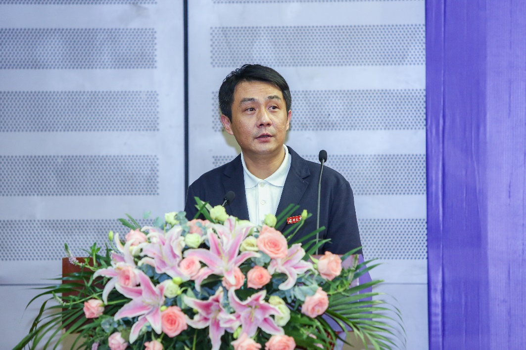 外国语学院伍雅清教授作为教师代表上台发言,深切幽默的话语感染了现场每一位嘉宾、同学。英语系教师代表伍雅清老师从校园的一花一草开始追溯、回忆,希望同学们记得在湖大的麓山巍巍、湘水泱泱,记得在湖大的葱葱岁月,希望同学们秉持三心:孝心、爱心和忠心,以及希望同学们选择相信及坚守;日语系教师代表杨昉老师则语重心长给予了毕业生们宝贵的人生建议及表达了对各位毕业生顺利毕业的殷切祝福。