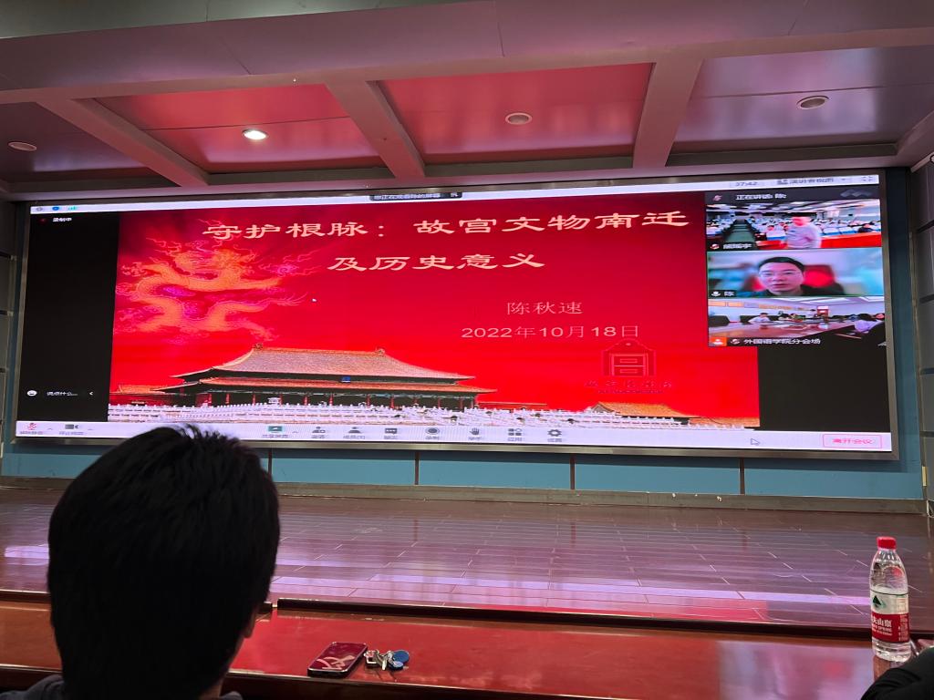 10月18日下午,外国语学院党委组织开展教职工集体政治理论学习,邀请故宫博物院副研究馆员陈秋速为教职工线上作中华传统文化专题讲座,题为“守护根脉-故宫文物南迁及历史意义”。陈老师从故宫博物院的成立,故宫文物南迁,一宫两院的行成与发展,到文物南迁的历史意义等四个方面,向师生展示了故宫博物院蕴含的中华五千年文明传承与发展,及其收藏的重要文化价值。