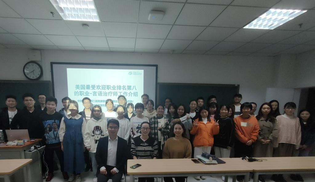 11月21日下午,英语(语言智能实验班)专业导论课顺利开展,围绕“语言与健康”的主题,讲授了“美国最受欢迎职业排名第八的职业——言语治疗师的工作介绍”。本次讲座旨在让学生了解语言智能方向及未来专业发展的可能性,以便同学尽早确定自己感兴趣的方向并做准备。本次讲座由班主任陈飞老师主持,有幸邀请到中南大学湘雅二医院康复医学科副主任王如蜜主讲、言语治疗师肖雪主任进行互动。