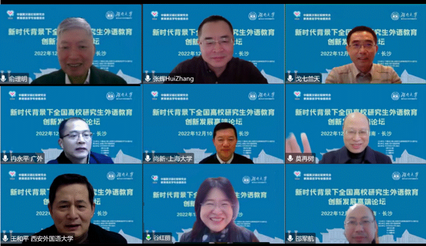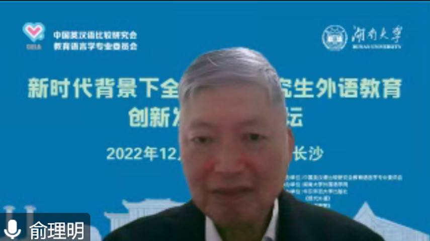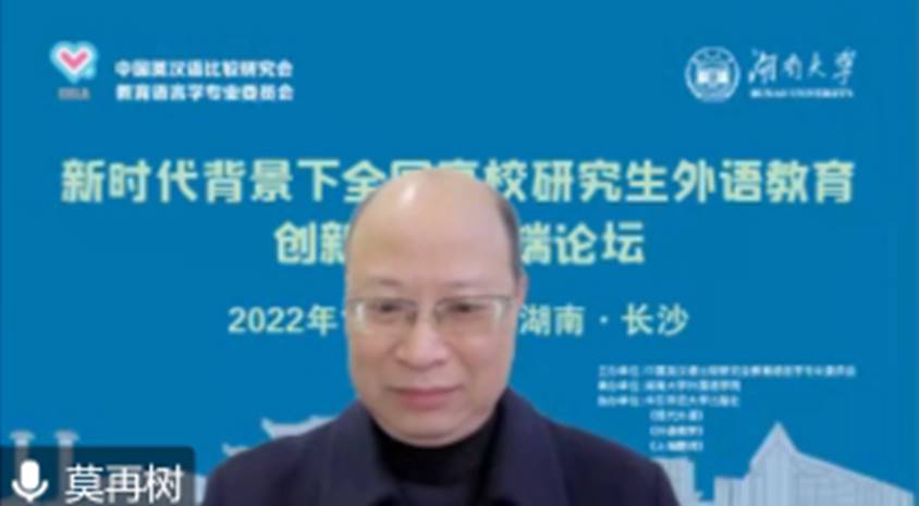 12月10日,外国语学院成功举办“新时代背景下全国高校研究生外语教育创新发展高端论坛”,来自全国各地高校的200余名专家学者及师生线上参会。中国英汉语比较研究会认知语言学专业委员会会长、上海交通大学俞理明教授,湖南大学外国语学院院长莫再树教授分别致辞。