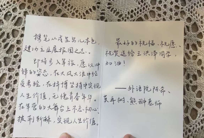 又是一年入伍季,携笔从戎,逐梦别样青春;建功军营,实现强国梦想。3月9日,外国语学院英语1902班的王洪泽同学顺利通过征兵选拔,即将在役前集训教育后奔赴军营,开启人生新征程。