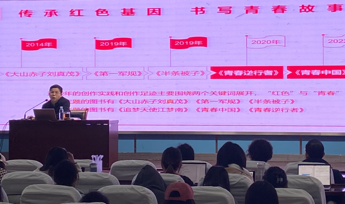 曾老师曾在抗疫期间,奔赴武汉抗疫一线采访创作,多次自费前往湖南、西藏等地进行采访创作,挖掘了包括江梦南、刘真茂在内的一批批时代典型人物。在讲座中,曾老师讲述了他在写作《青春逆行者》以及《青春中国》时遇见的“抗疫的青年一代”和“大学生西部志愿者”,生动讲述了这些新时代的“雷锋”的感人故事。这些故事彰显的是中国共产党人以及我们新时代青年这种信念的高度、血脉的浓度、情感的温度、艰辛的程度和奋斗的力度。