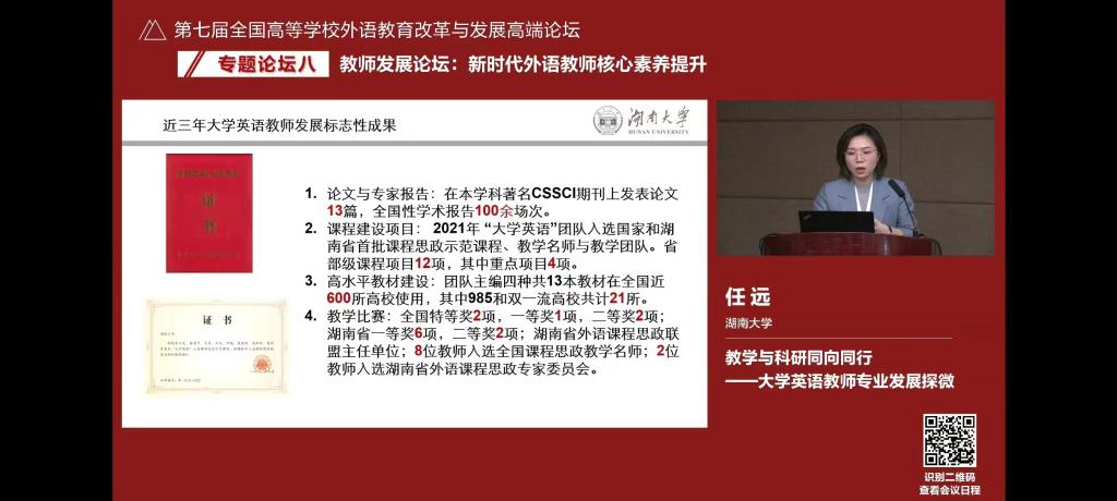 任远副院长以“教学与科研同向同行——大学英语教师专业发展探微”为题在分论坛发言,分享了本校外语师资建设中如何兼顾教师的教学与科研能力提升,指出从外语院系应从发展要求、制度支持、团队建设、管理评价、合作平台等五方面为外语教师专业发展提供保障,实现分类管理,优化发展;并强调教学与科研相结合,两者互相促进,从而实现教师专业发展,深化人才培养。