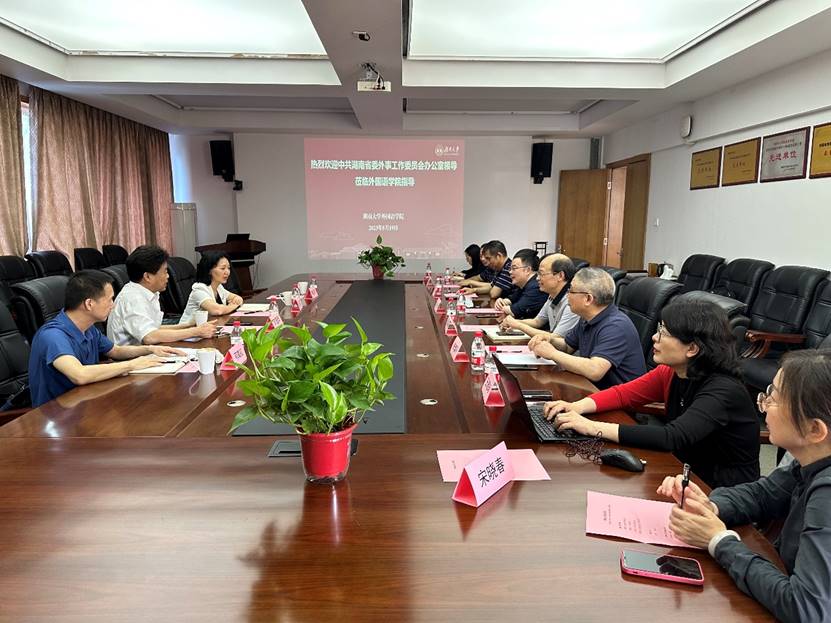 5月19日上午,中共湖南省委外事工作委员会办公室副主任邱爱华等一行来我院开展主题教育调研,我校副校长谢赤参加调研座谈会。本次调研主要面向我校新成立的“湖南省湖湘文化译介与国际传播中心”,结合主题教育要求,深入了解中心运行相关情况,推动相关工作向前发展。会上,邱爱华副主任表示,省委外事办将对中心建设和发展加大支持力度,帮助中心搭建平台,通过办校共建,切实推动中心把“讲好湖南故事、传播好湖湘文化”的中心任务落到实处。