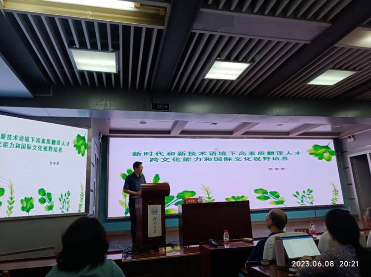 党争胜教授首先介绍了人工智能技术和ChatGPT蓬勃发展的时代背景,指出新技术能减轻译者劳动强度、提高翻译效率,但同时对译者的工作也提出了挑战:译者能力结构从语言能力为主向以译后编辑和译后审定能力、跨文化能力、开阔的国际视野为主的能力结构转换。接着党教授着重阐释了跨文化能力和国际文化视野的内涵??缥幕芰Πǘ嘤镅阅芰?、文化理解能力、整合能力、共情能力和开放包容的精神与存异合作的态度。这种能力要求从事跨文化翻译、传播和交流工作的人员对自身所属的文化和其他文化有良好的把握。他认为应该把学生的跨文化能力作为翻译专业人才的核心能力来培养。他指出国际文化视野,小而言之,是从译入语国家的文化视野思考、分析和看待问题;大而言之,是从区域乃至全世界的视野思考、分析和看待问题。具有开阔的国际文化视野是推动中国文化走出去、讲好中国故事、传播好中国声音的必备条件。