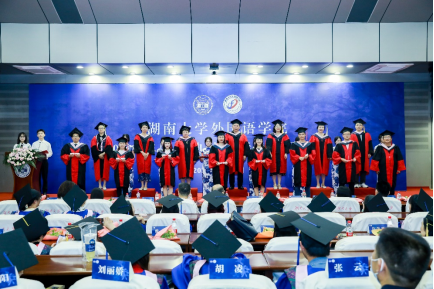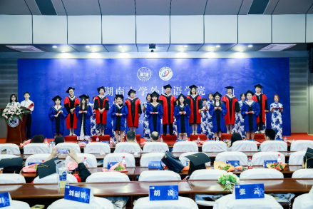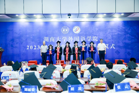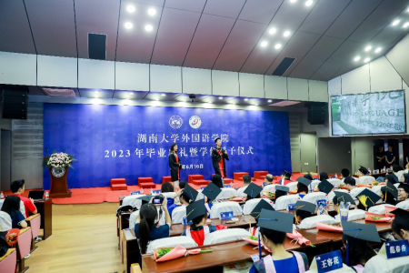 鹏北海,凤朝阳,青春筑梦,劈波斩浪。6月16日下午,湖南大学外国语学院2023年毕业典礼暨学位授予仪式于逸夫楼报告厅举行。2023届本、研毕业生、全体院领导、研究生导师代表、本科生班主任代表、辅导员、行政办、培养办老师出席典礼。典礼由毕业生李中海、贵胡荣主持,同步进行线上直播。