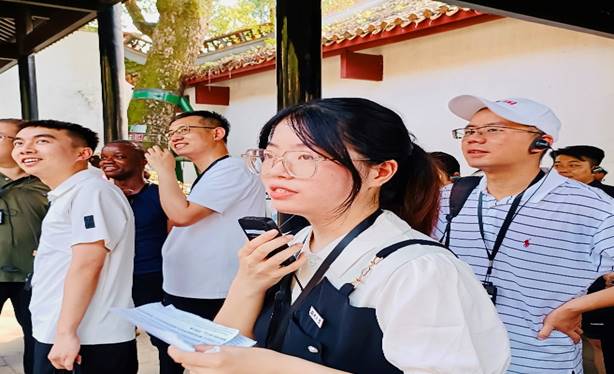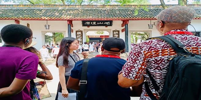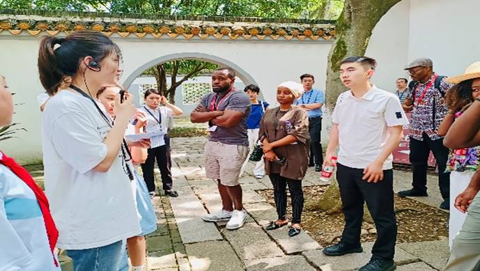 7月2日上午,参与第三届中国-非洲经贸博览会的外宾及陪同人员来到湖南大学岳麓书院进行参观,本次活动通过湖南大学团委刘盎松老师、美丽努尔老师协调,外国语学院胡凌老师、许俊老师、许潞老师统筹安排外院学子段?;?、于卉钰、叶舒琪及刘千汇四位同学参与全程陪同导览和英语讲解志愿服务。